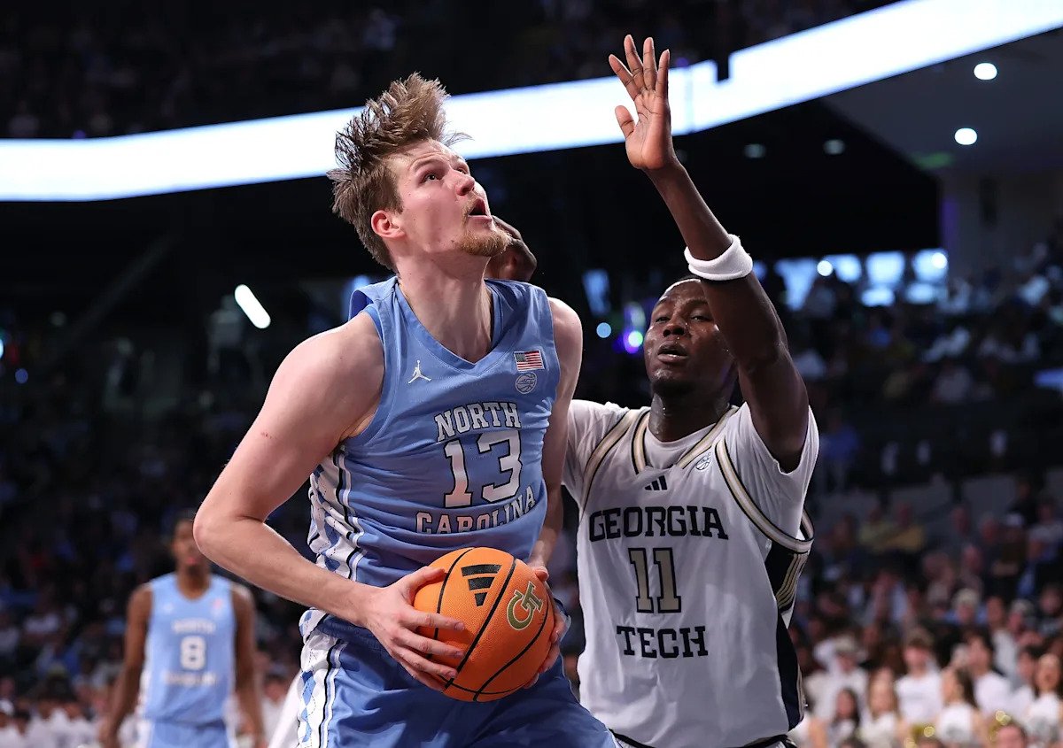 ATLANTA, GEORGIA – JANUARY 31: Henri Veesaar #13 of the North Carolina Tar Heels attacks the basket against Baye Ndongo #11 of the Georgia Tech Yellow Jackets during the second half at Hank McCamish Pavilion on January 31, 2026 in Atlanta, Georgia. (Photo by Kevin C. Cox/Getty Images)