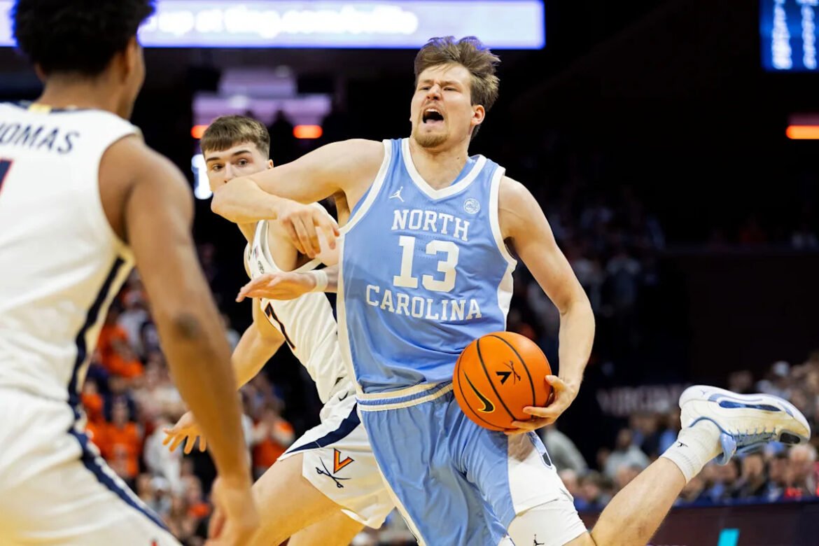 CHARLOTTESVILLE, VIRGINIA – JANUARY 24: Henri Veesaar #13 of the North Carolina Tar Heels drives past Johann Gruenloh #17 of the Virginia Cavaliers in the first half of a game at John Paul Jones Arena on January 24, 2026 in Charlottesville, Virginia. (Photo by Ryan M. Kelly/Getty Images)