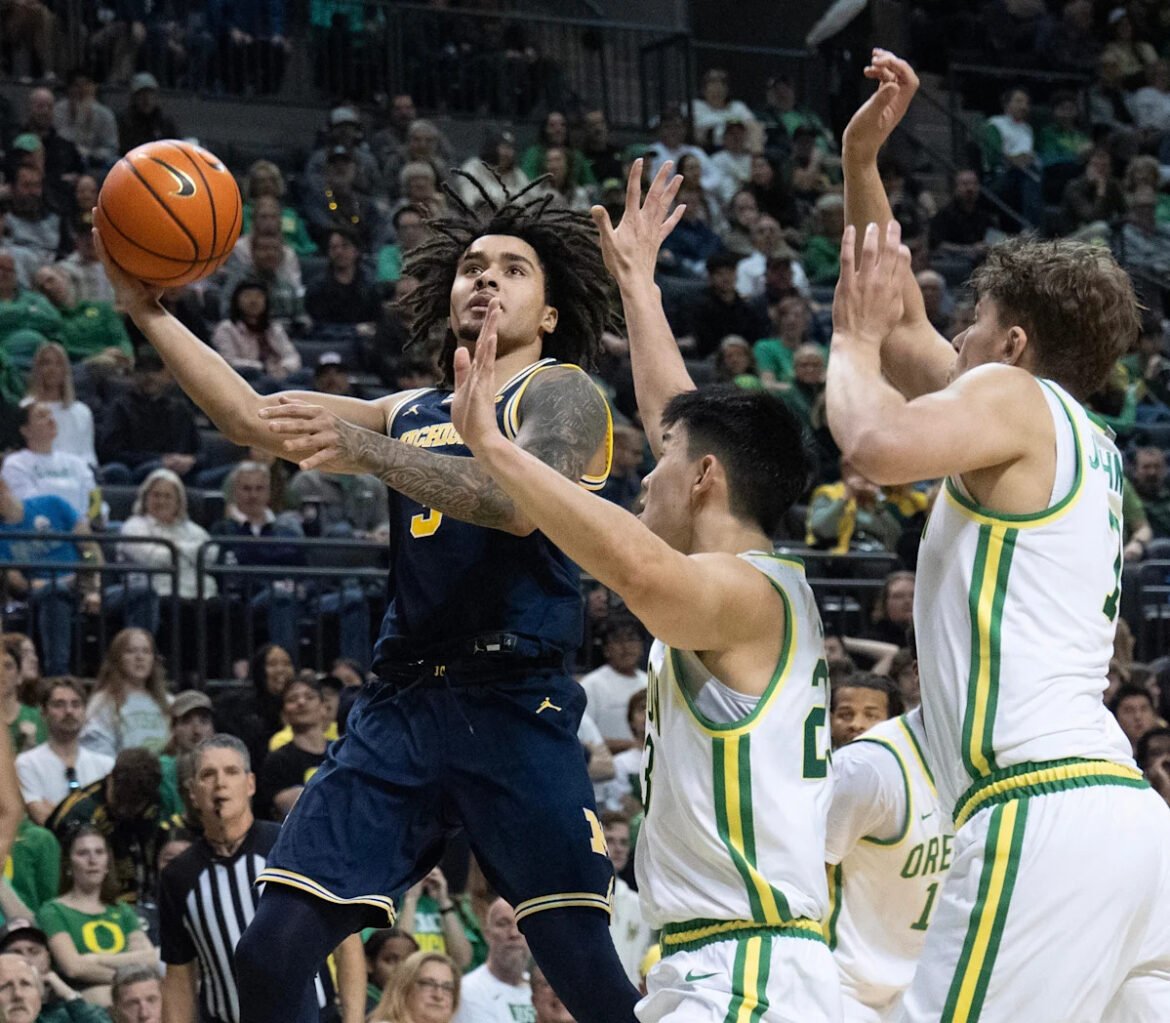 Michigan’s Elliot Cadeau, left, shoots past Oregon’s Wei Lin, center, and Luke Johnson during the first half at Matthew Knight Arena Jan. 17, 2026.