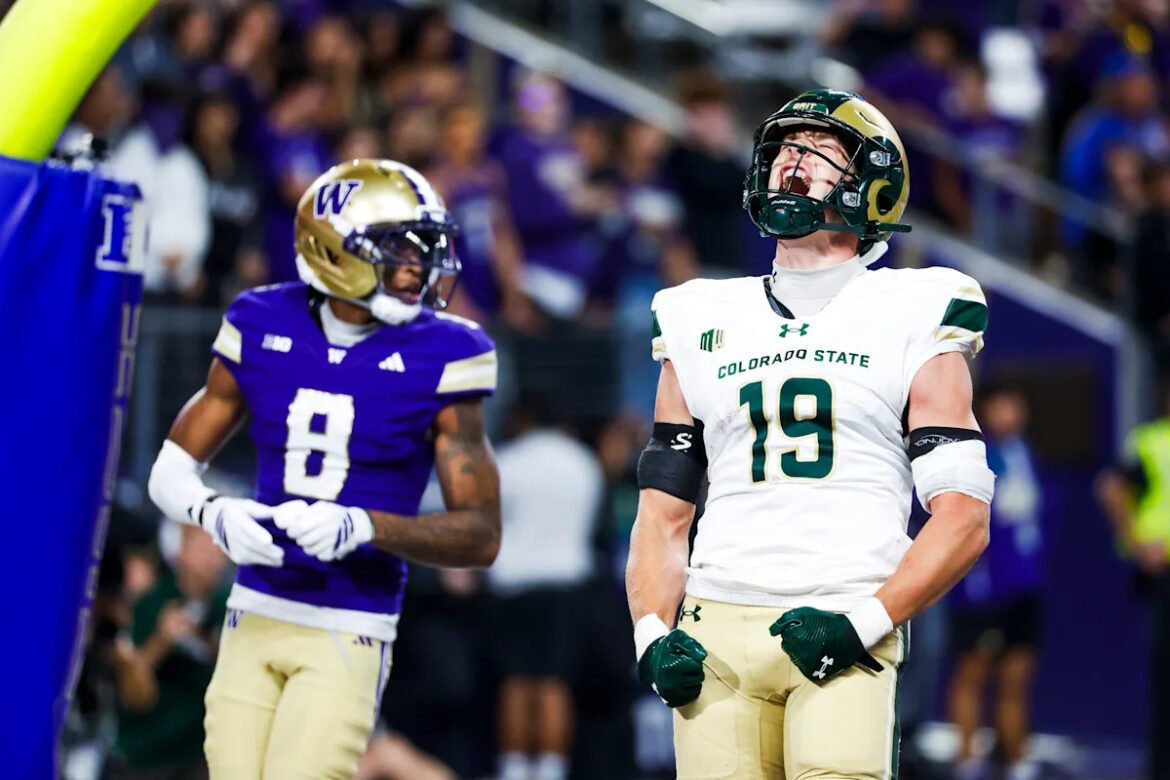 Aug 30, 2025; Seattle, Washington, USA; Colorado State Rams tight end Jaxxon Warren (19) reacts after catching a touchdown pass against the Washington Huskies during the third quarter at Husky Stadium. Mandatory Credit: Joe Nicholson-Imagn Images