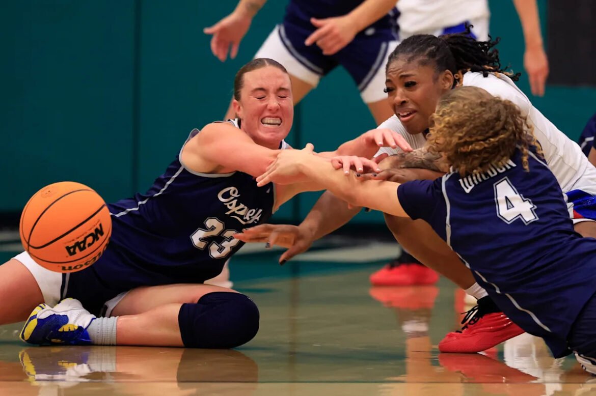 West Georgia Wolves guard Grace O’Gara (5) trips over North Florida Ospreys guard Alexa Washington (22) during the second quarter of the ASUN Women’s Basketball Championship first round matchup at Swisher Gymnasium, Tuesday, March 3, 2026, in Jacksonville, Fla. [Corey Perrine/Florida Times-Union]