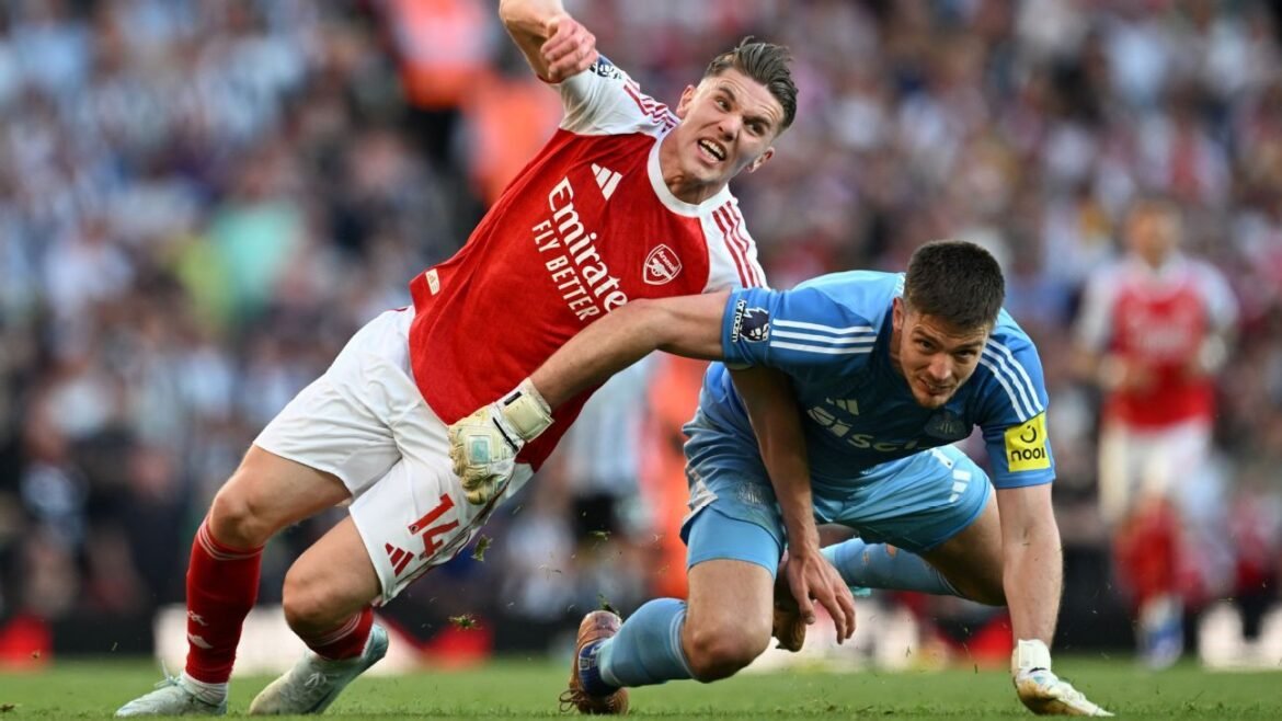 What happened: A ball played over the top of the Newcastle United defence left Arsenal attacker Viktor Gyökeres beyond the last defender, chasing the loose ball. Newcastle goalkeeper Nick Pope left his area and he too chased the loose ball — however he slipped, panicked and then illegally held the Arsenal striker, stopping Gyökeres from retrieving the ball. Referee Sam Barrott produced a yellow card deeming the offence did not deny an obvious goal scoring opportunity.
