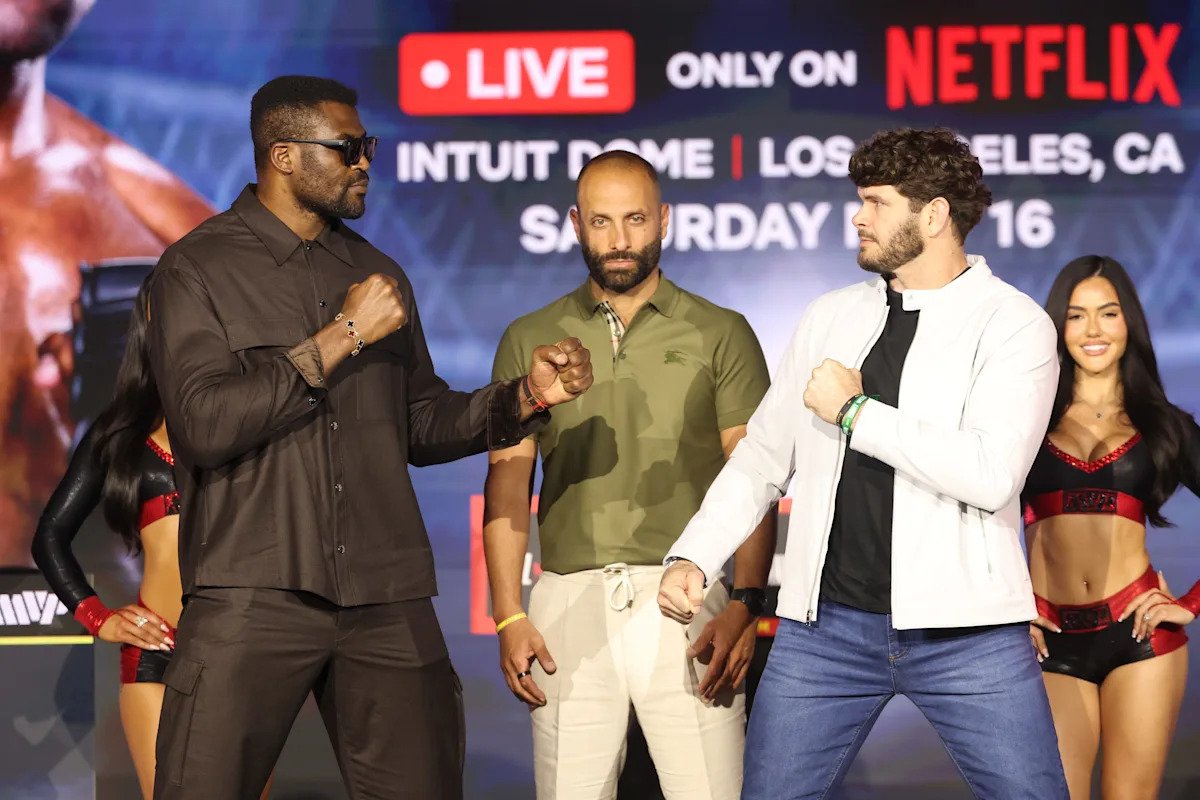 NEW YORK – Former UFC champion Francis Ngannou and 2018 PFL champ Philipe Lins had another staredown at Wednesday’s press conference for their heavyweight clash at Rousey vs. Carano on Netflix.