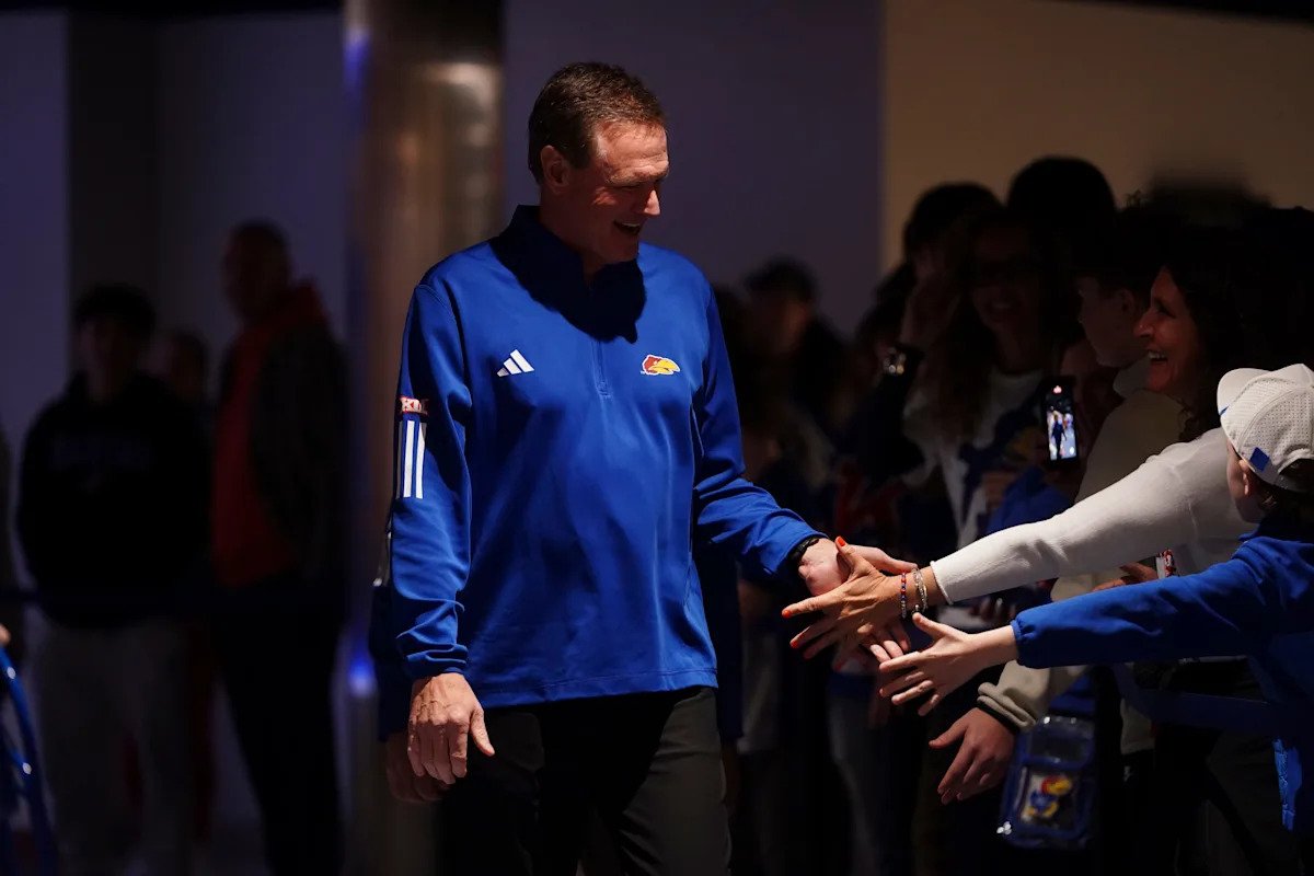 Kansas basketball coach Bill Self walks out before the game against Baylor inside Allen Fieldhouse on Jan. 16, 2026.
