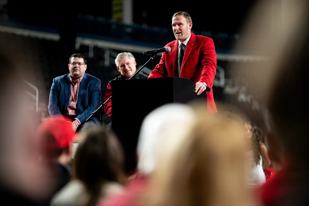 Jordan Harmon, Austin Peay’s new Athletic Director, speaks as he is introduced at F&M Bank Arena in Clarksville, Tenn., Friday, Feb. 13, 2026.
