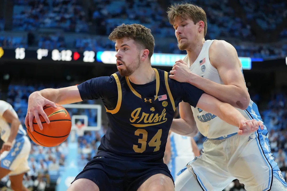 Jan 21, 2026; Chapel Hill, North Carolina, USA; Notre Dame Fighting Irish forward Matthew MacLellan (34) with the ball as North Carolina Tar Heels center Henri Veesaar (13) defends in the first half at Dean E. Smith Center. Mandatory Credit: Bob Donnan-Imagn Images