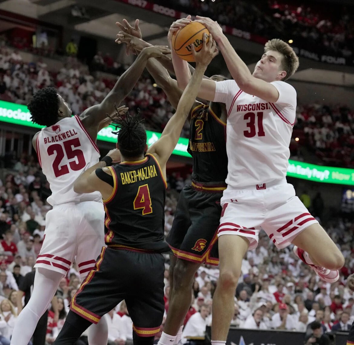 Wisconsin forward Nolan Winter (31) competes again USC forward Chad Baker-Mazara (4) and guard EJ Neal (12) during the second half of their game Sunday, January 25, 2026 at the Kohl Center in Madison, Wisconsin. USC beat Wisconsin 73-71.