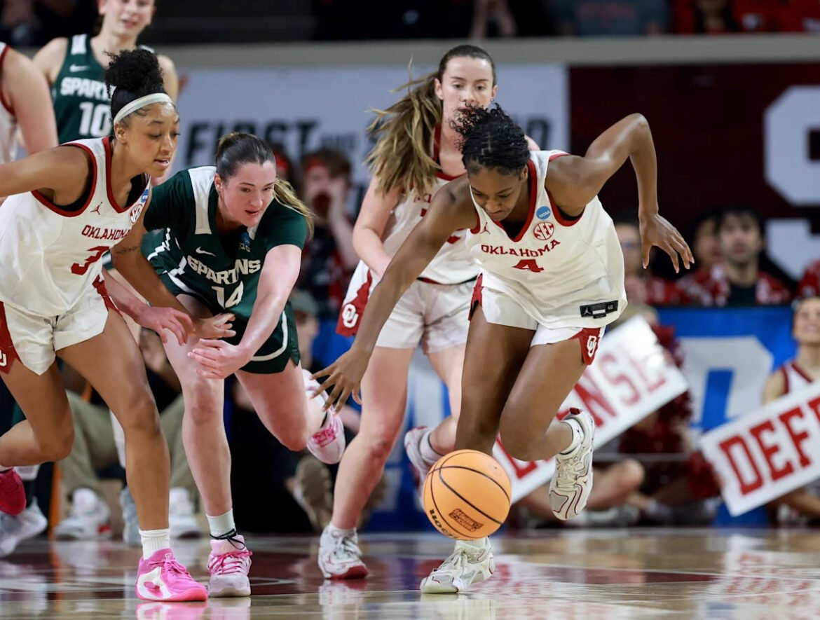 Oklahoma’s Caya Smith (4) gets a steal from Michigan State’s Grace Vanslooten (14) during a second-round game in the NCAA women’s basketball tournament between the Oklahoma Sooners and Michigan State Spartans at Lloyd Noble Center in Norman, Okla., Sunday March 22, 2026.