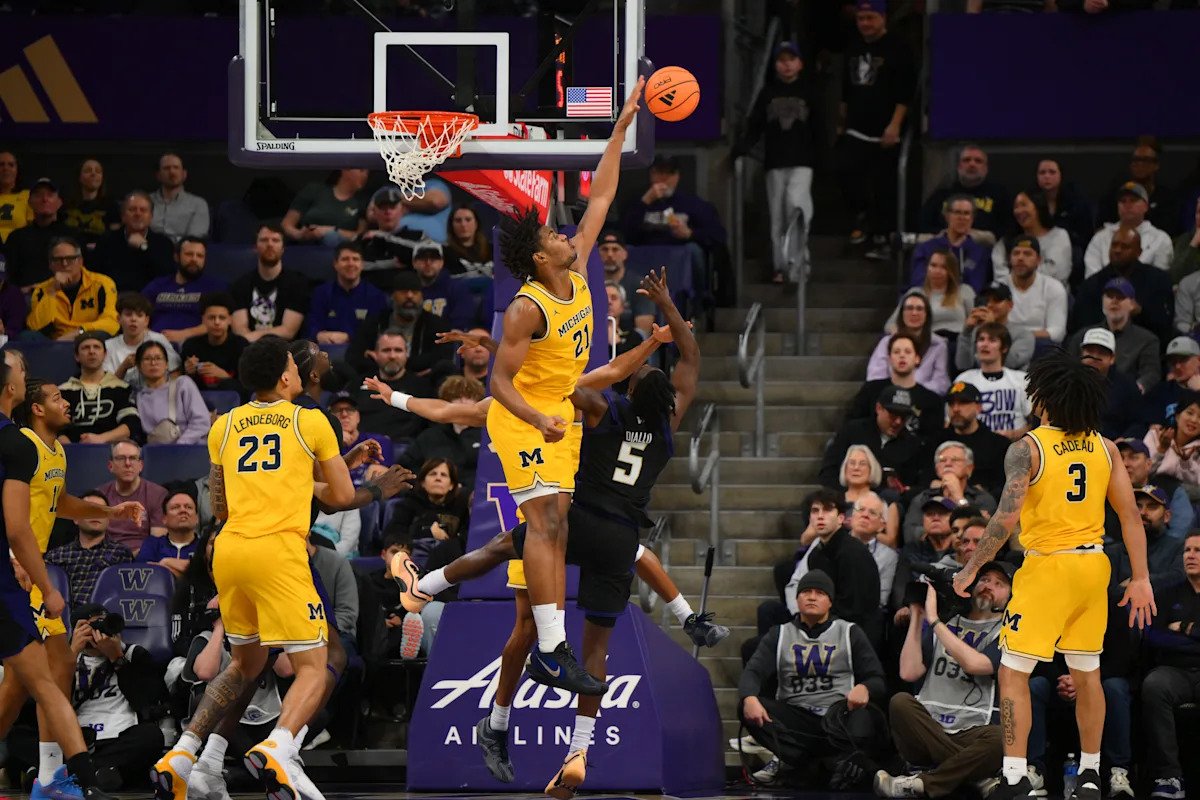 Michigan Wolverines forward Morez Johnson Jr. (21) blocks a shot by Washington Huskies guard Zoom Diallo (5) during the second half at Alaska Airlines Arena in Seattle on Wednesday, Jan. 14, 2026.