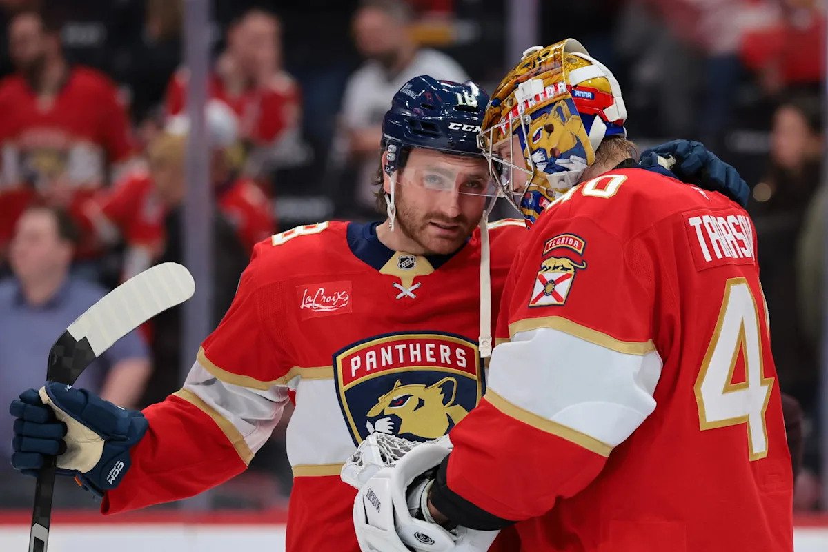 Photo caption: Dec 17, 2025; Sunrise, Florida, USA; Florida Panthers left wing Noah Gregor (18) celebrates with goaltender Daniil Tarasov (40) after the game against the Los Angeles Kings at Amerant Bank Arena. (Sam Navarro-Imagn Images)
