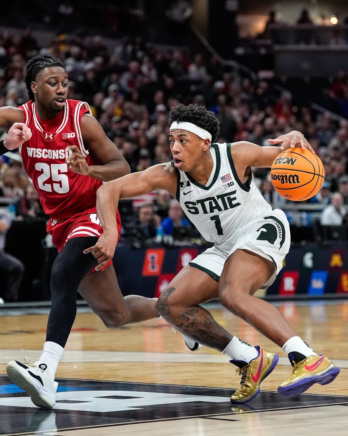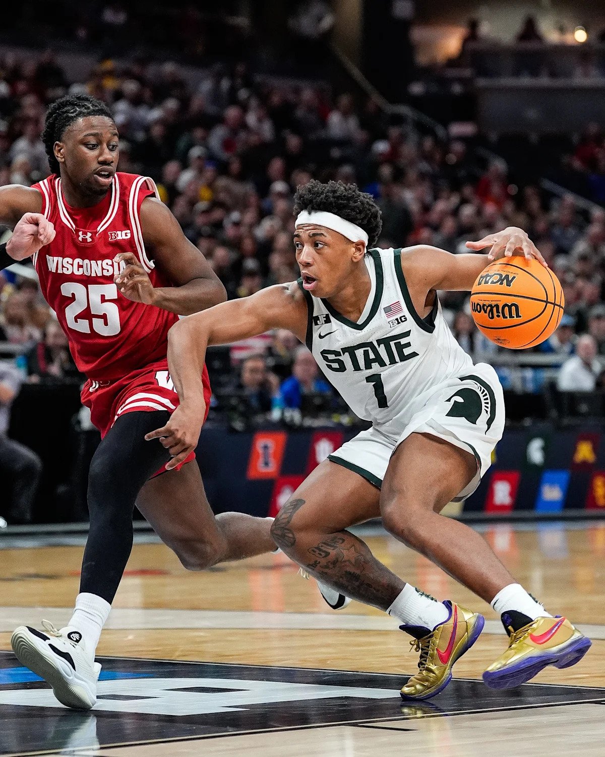 Michigan State guard Jeremy Fears Jr. (1) dribbles against Wisconsin guard John Blackwell (25) during the second half of Big Ten Tournament semifinal at Gainbridge Fieldhouse in Indianapolis, Ind. on Saturday, March 15, 2025.